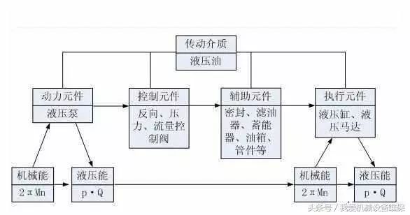 一个完整的液压系统由以下部分组成:动力元件、执行元件、控制元件、辅助元件和液压油;动力元件(系统中的油泵)的作用是将电动机的机械能转换成液体的压力能,给整个液压系统提供动力。执行元件(如液压缸和液压马达)的作用是将液体的压力能转换为机械能,驱动负载作直线往复运动或回转运动。控制元件(即各种液压阀)在液压系统中控制和调节液体的压力、流量和方向。辅助元件包括油箱、滤油器、冷却器、加热器、压力表、油位油温计等。液压油是液压系统中传递能量的工作介质。